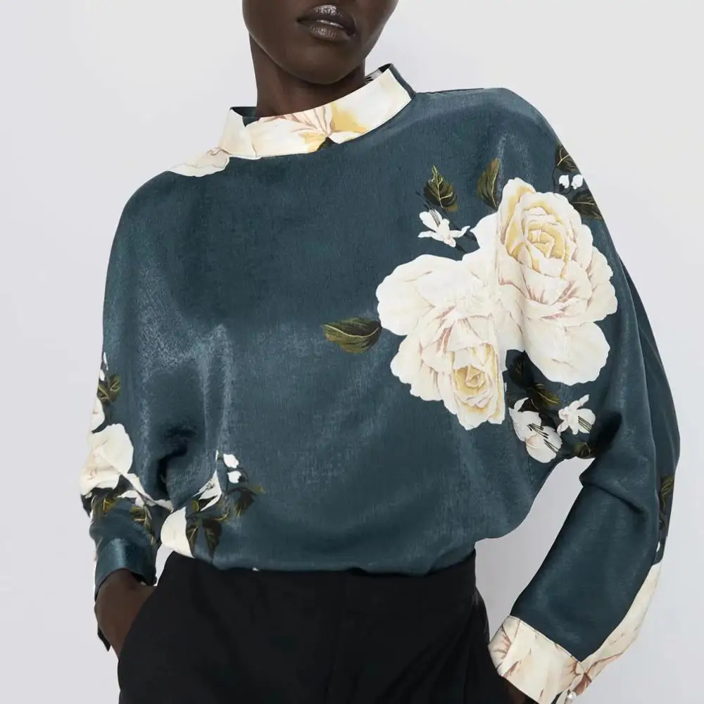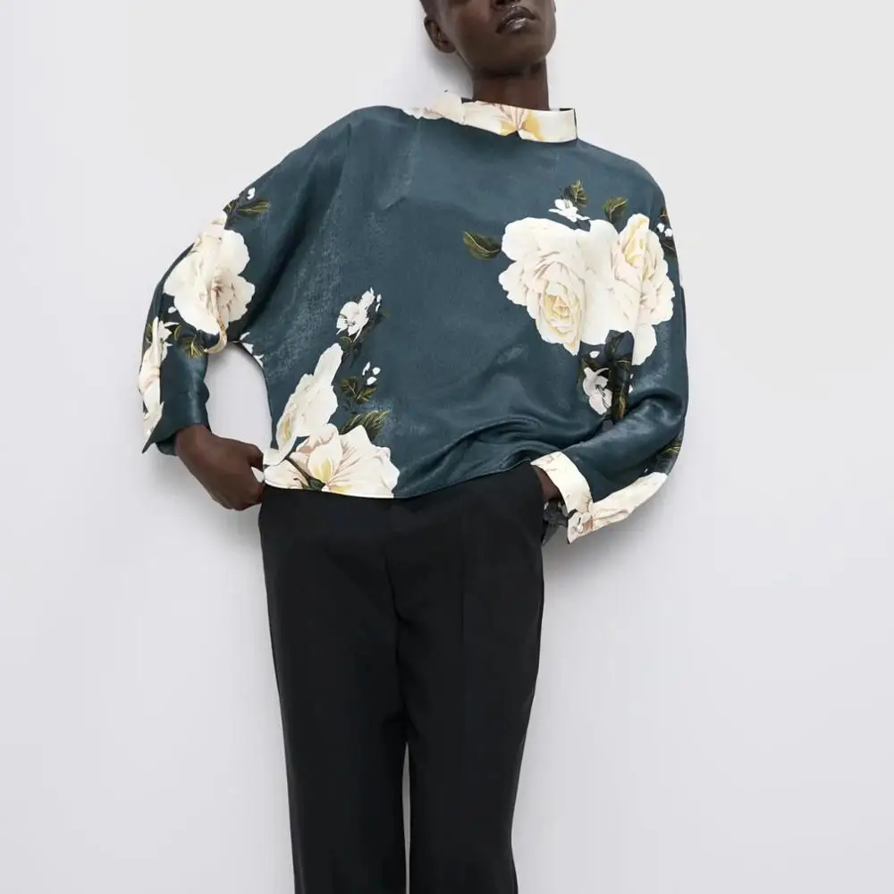 Promo ZA blouse shirt women floral pattern printed tops blue chiffon back buckle Casual ladies blouse fem