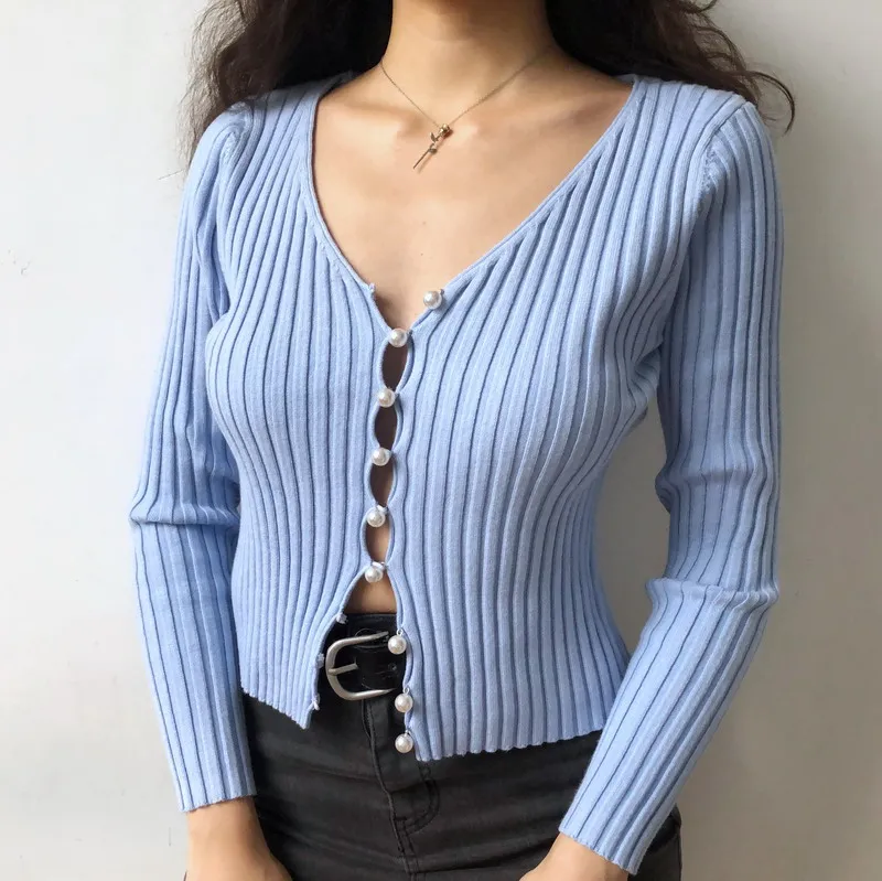 Best Kawaii cardigan women autumn winter sweater women v neck sweater pearl ladies knitted sweater crop