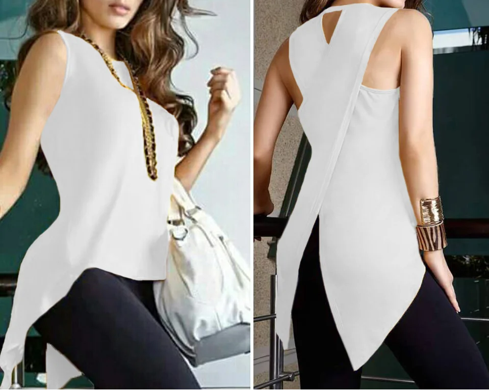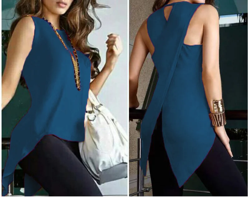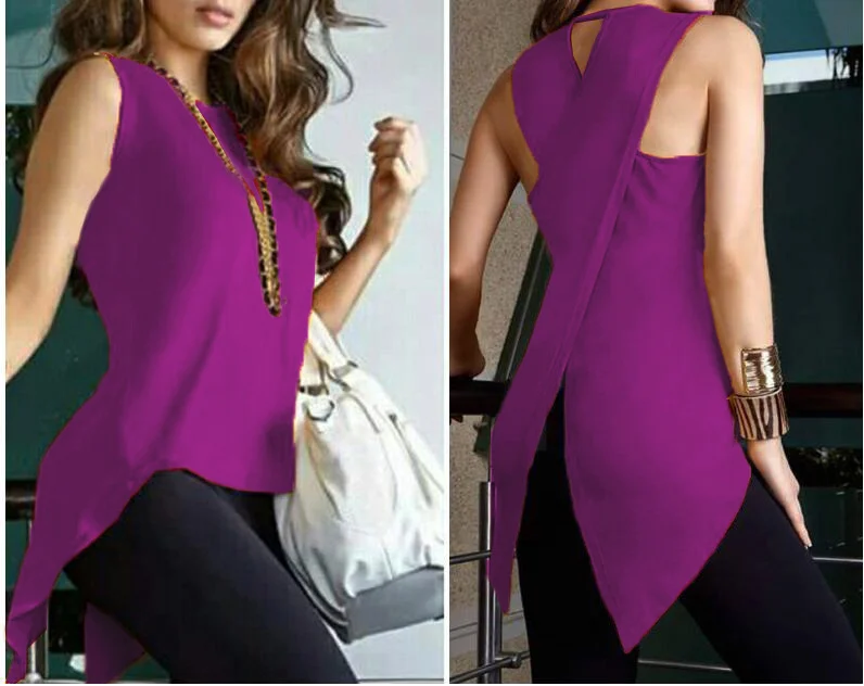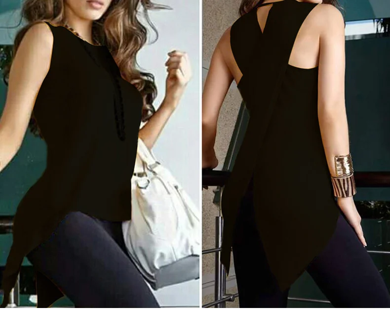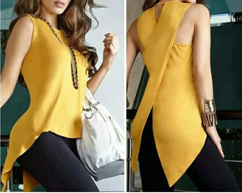 Best Summer Yellow Blouses Sleeveless Ladies Top Cross Irregular O-Neck Woman Blouse Female Shirt Tops T