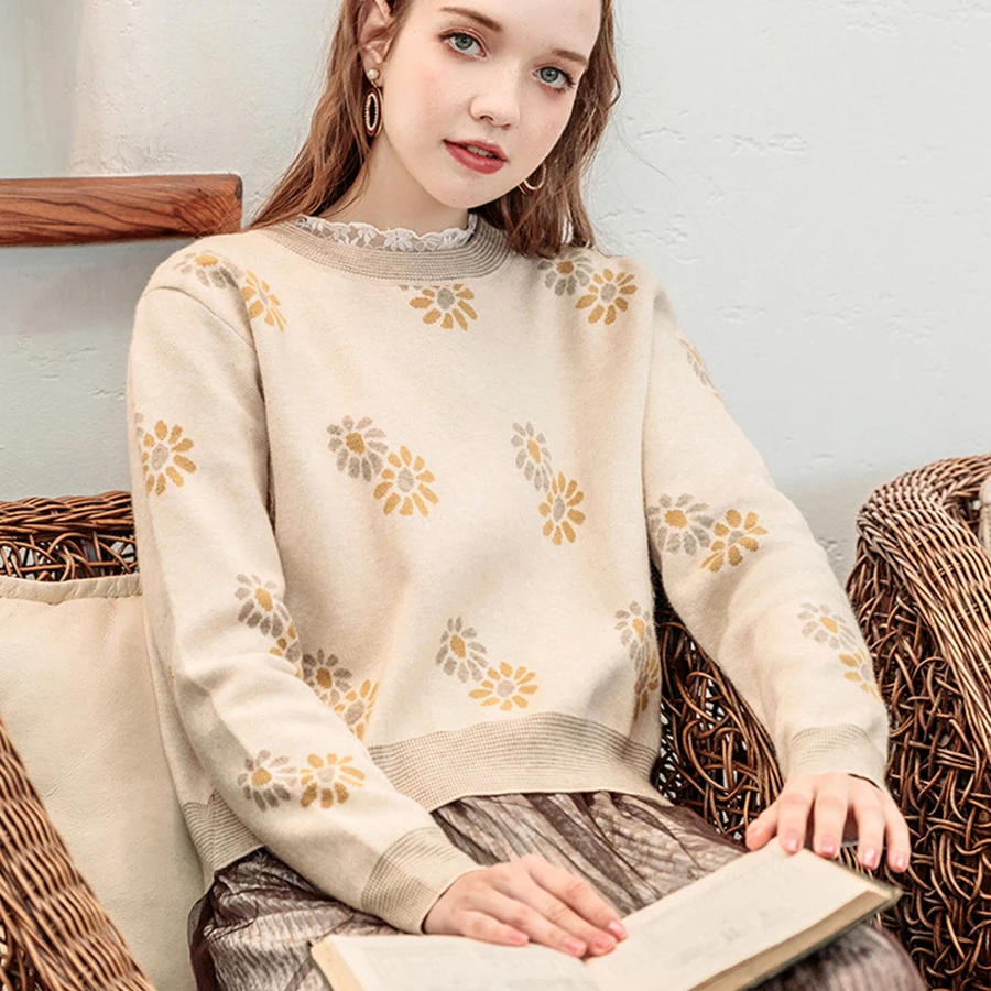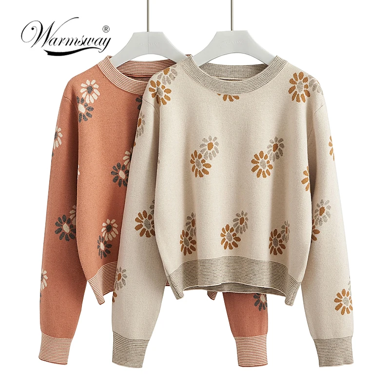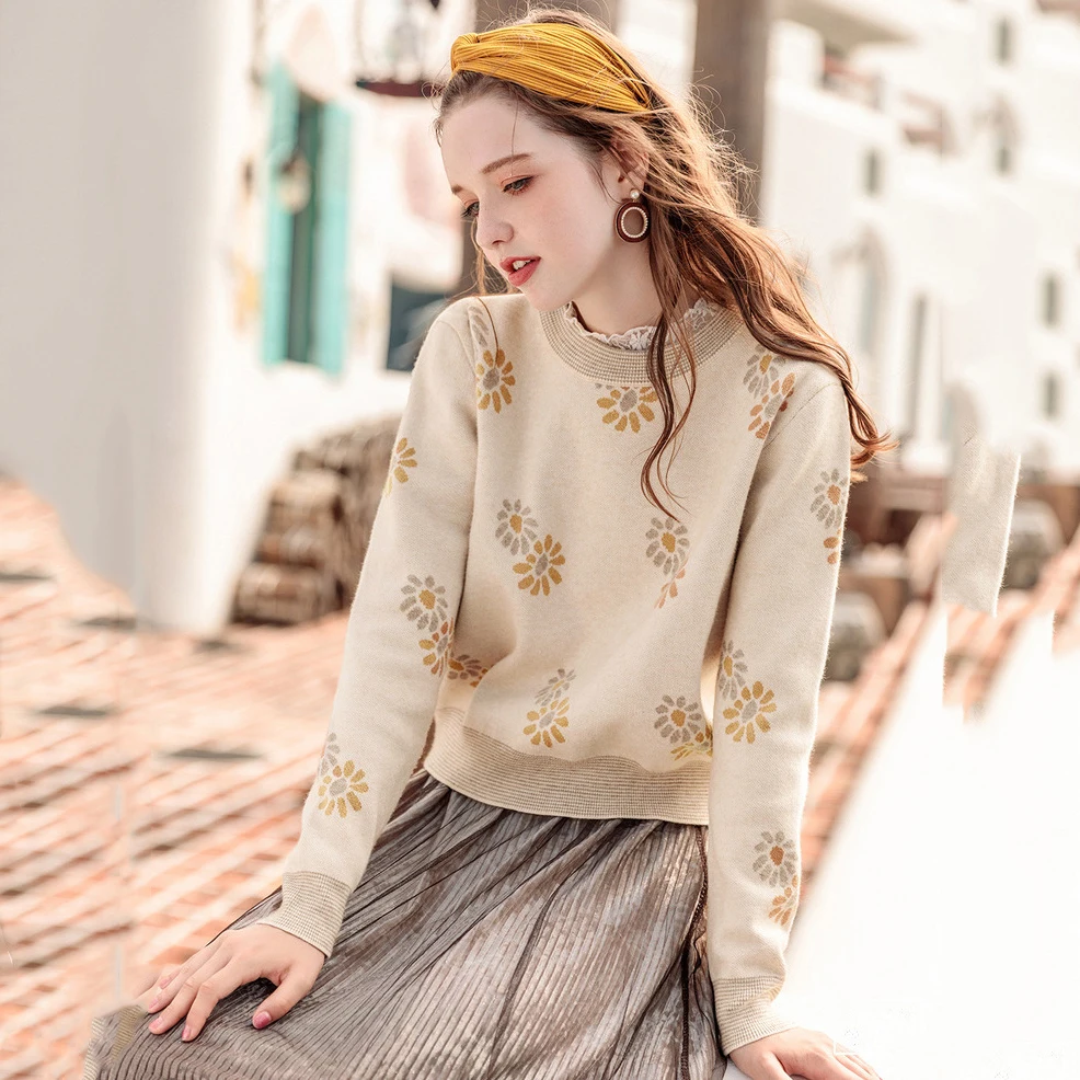 Buy Autumn Women Crop Pullover Sweater Floral Sweater Girls Long Sleeve Knit O Neck Jumper C-287