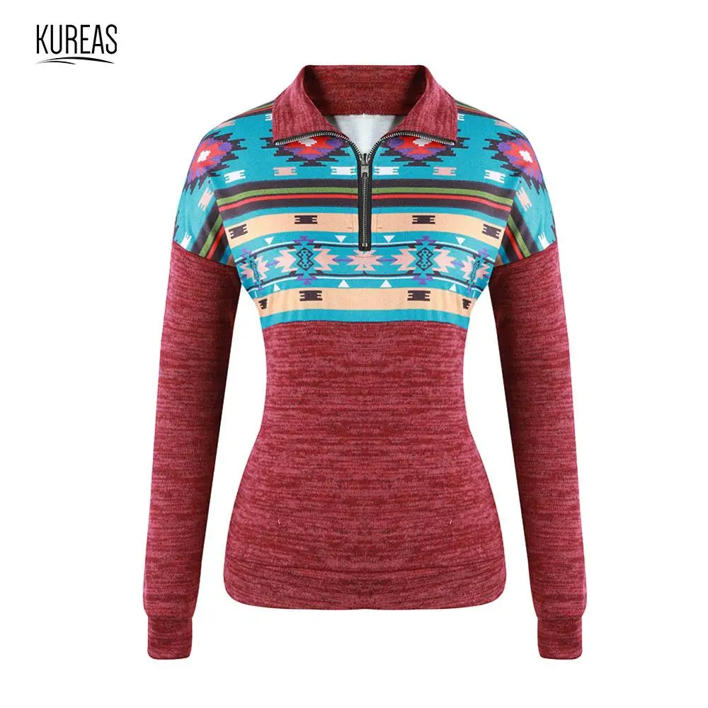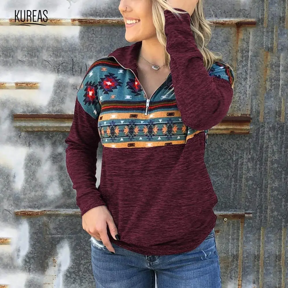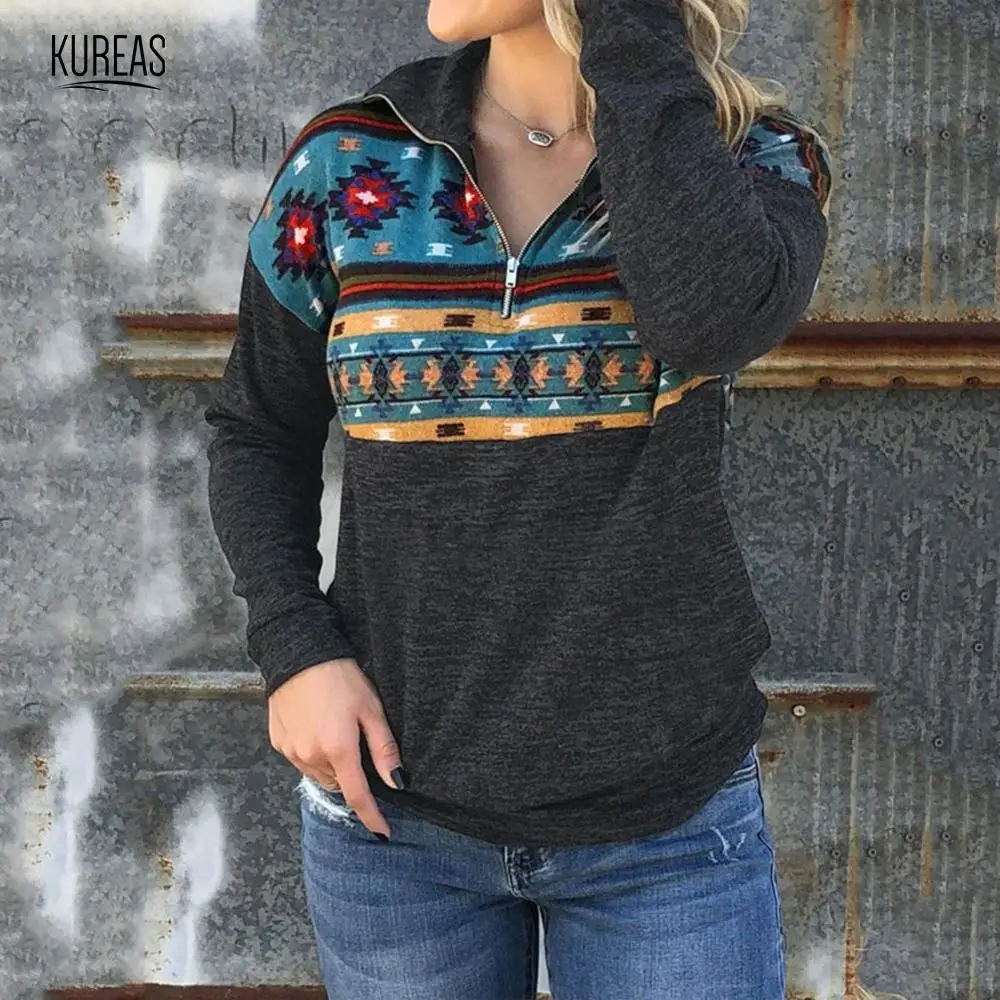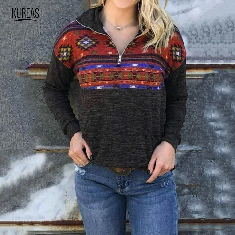 Promo Kureas Women Hoodies Winter Autumn National Print Sweatshirt Tops Zipper Collar Long SLeeve Ethnic