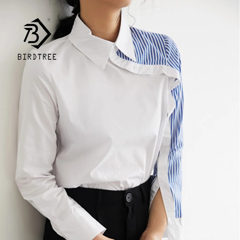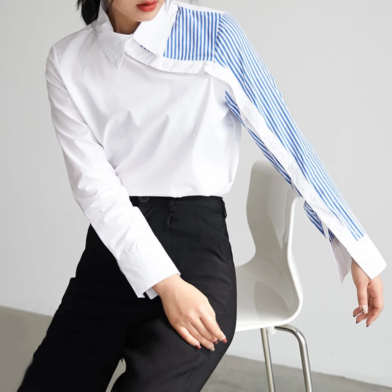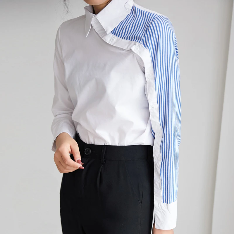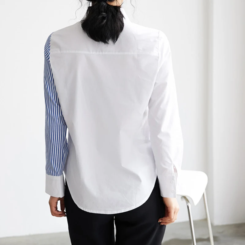 New New Arrival Women Turn Down Collar White Shirt Blouse Striped Patchwork Elegant Chic Korean Style F