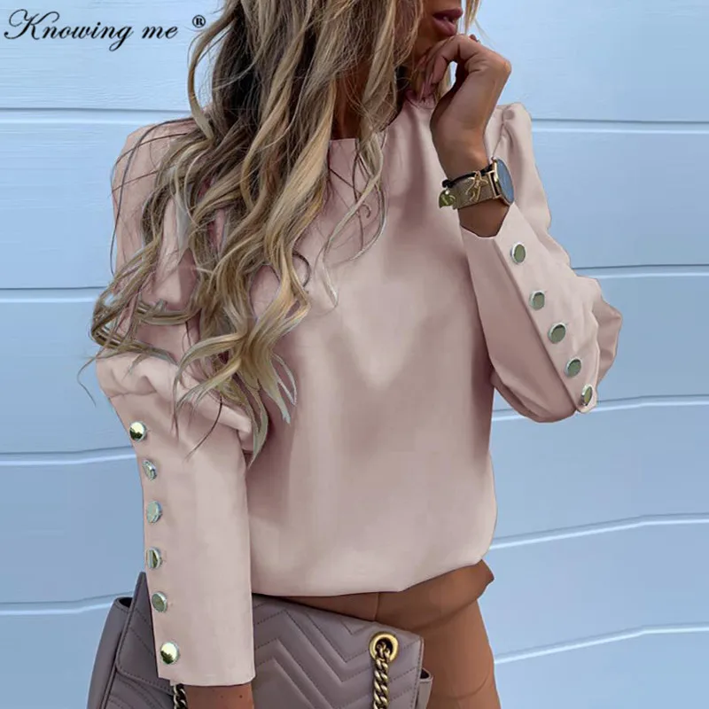 New women Autumn Puff shoulder blouse shirts Office Lady Metal Buttoned Detail Blouses Elegant Pineappl
