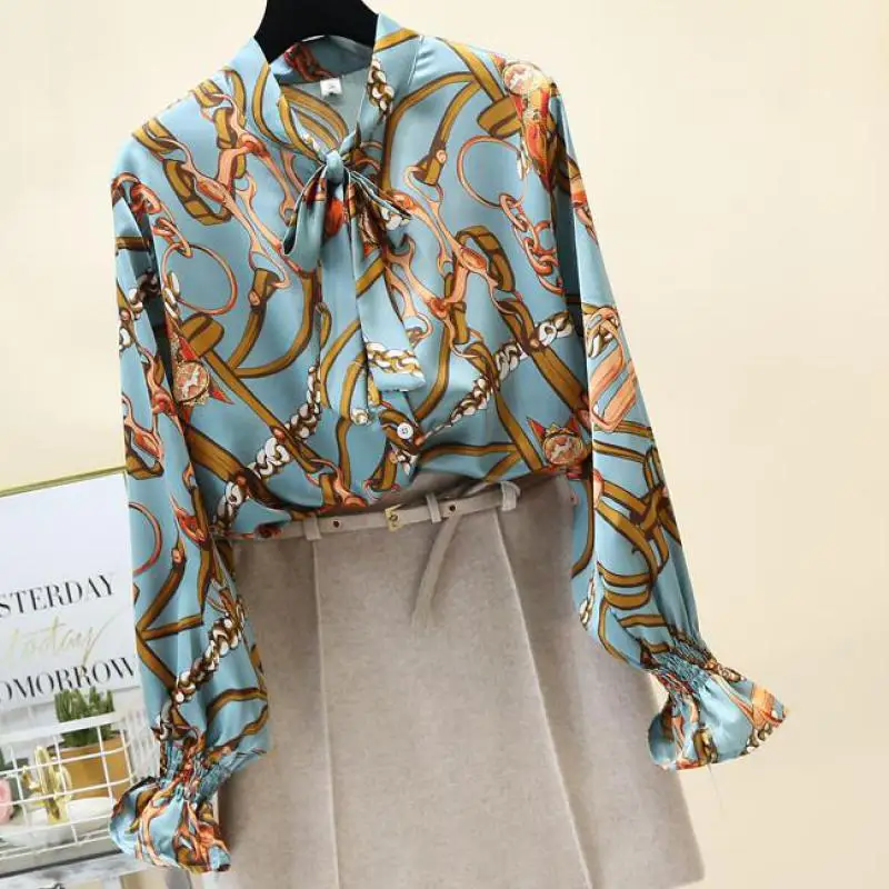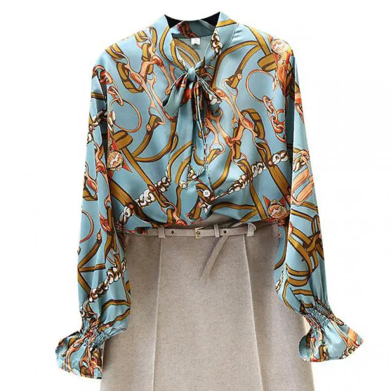 Promo Women Stylish Chains Print Blouse Bow Tie Collar Long Sleeve Oversized Shirt Female Casual Vintage
