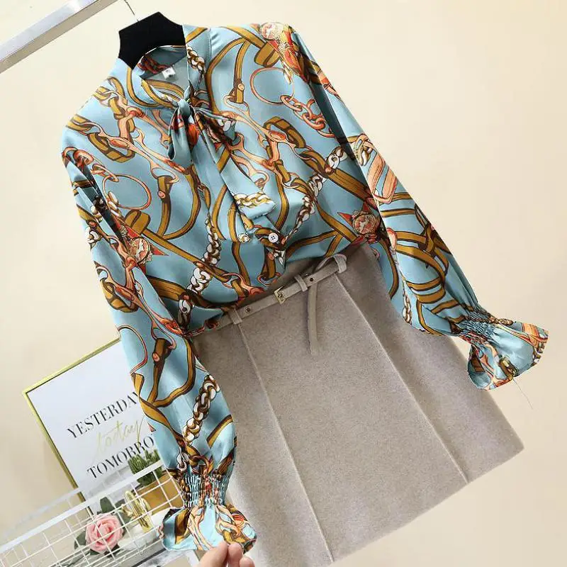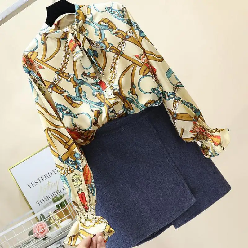 New Women Stylish Chains Print Blouse Bow Tie Collar Long Sleeve Oversized Shirt Female Casual Vintage