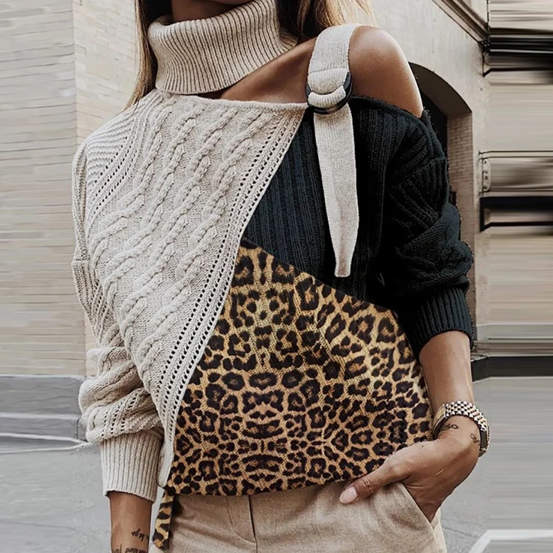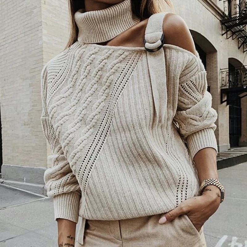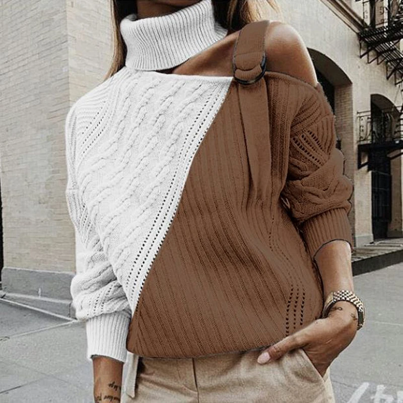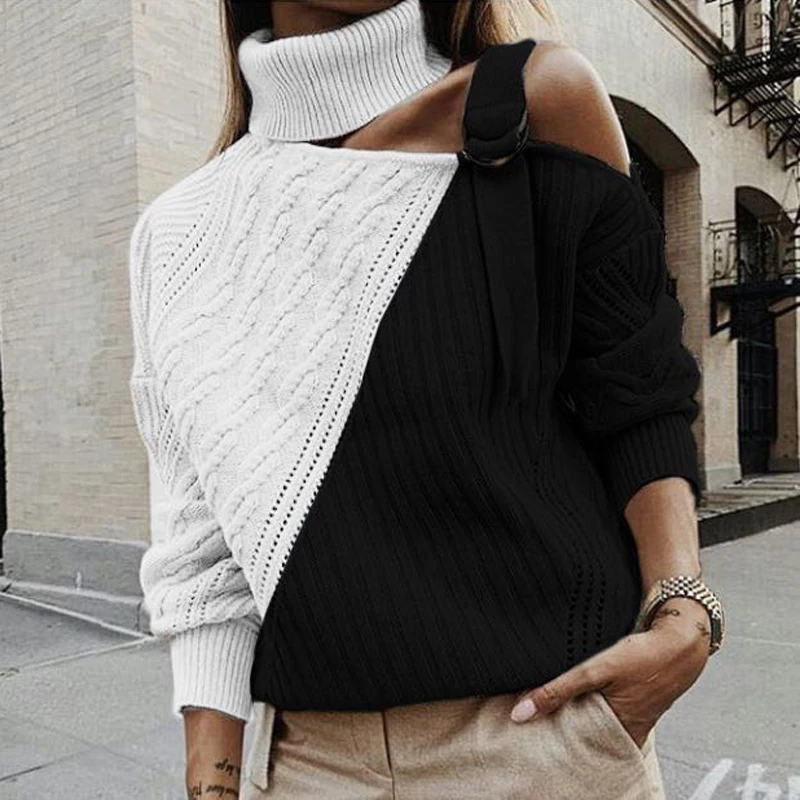 Promo Women Patchwork Turtleneck Sweater Sexy Off Shoulder Buckle Knitted Pullover Autumn Winter Long Sle