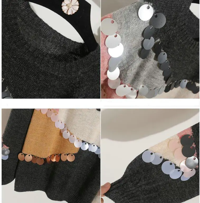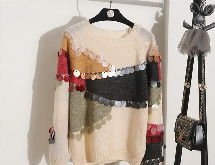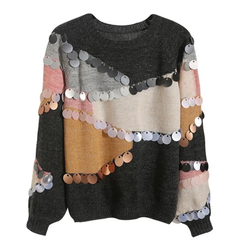 Best Women Sequined Sweater and Pullovers Long Sleeved Korean Fashion Knit Mohair Sweater Loose Spliced